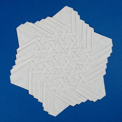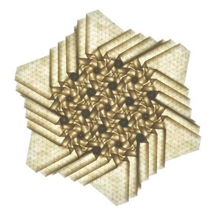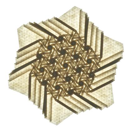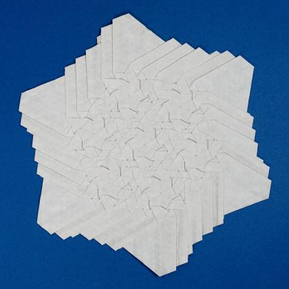 This is achieved by starting with a custom-rotated grid, by folding with awareness of the underlying tiling, and by changing some rhombus twists in the last layer around the center to triangle twists.