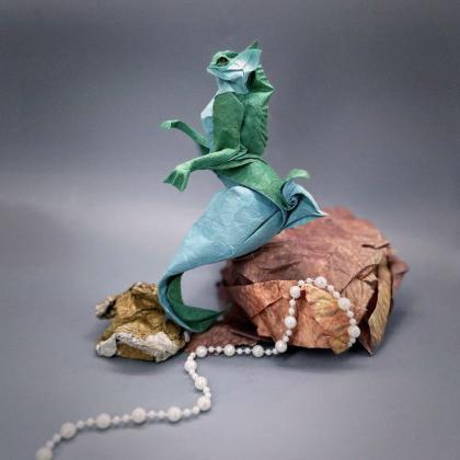 The original design is the Hippocampus. While folding and shaping it, I found the original offered ample room for modification, inspiring me to create an entirely new marine creature! It is a novel species, similar to a mermaid yet with a head more akin to a terrestrial animal. Its golden eyes glow with a wise and enchanting light, its large ears allow it to pick up sound waves from extreme distances, and it boasts massive dorsal fins, webbed palms, and a powerful, robust tail that lets it reach astonishing speeds in the ocean. I reworked the original caudal fin into a curled anal fin, like a blooming flower. It perches on a reef, chanting a mysterious melody to lure its prey near.