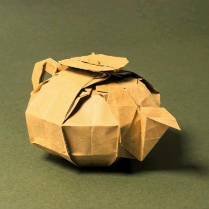 This teapot is folded from a single sheet of paper. A classic vessel in traditional Chinese culture, the teapot embodies Zen philosophy and the joy of tranquil leisure. This origami work is a flawless piece with no weak angles, and can be admired from every perspective.