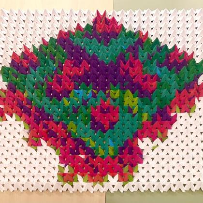 This model turns an image into a fully realized origami piece, using 2300 modules to construct a Square Koch Cube using a 46 x 50 pixel grid. By treating each pixel as a structural unit, the model is subdivided into square groups of 4, adding stability to the image. Through a computational process, the image is mapped to 35% of its original size and uses only 12 colors. The model establishes origami as a computational and structural medium.