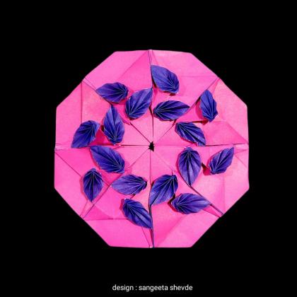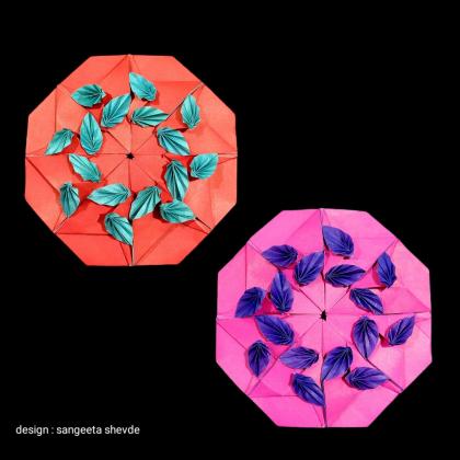 This modular mandala has a beautiful arrangement of leaves which swirl and dance in a rthymic circular pattern. Like an elegant movement of leaves in a gentle wind. The leaves appear to be interacting softly with each other as they twirl and move following the synchronised path.