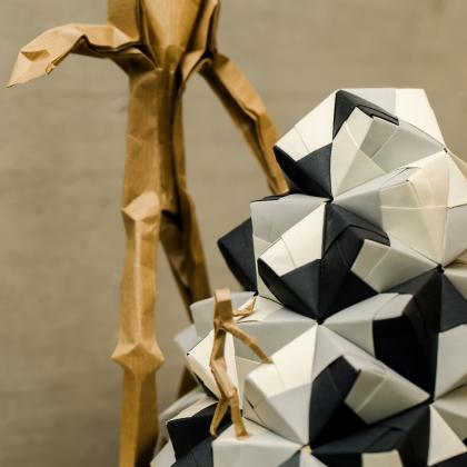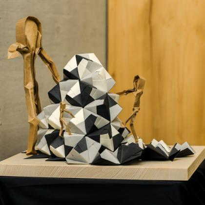 A minimalistic three dimensional composition of Sonobe units and simple human figures.