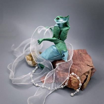 The original design is the Hippocampus. While folding and shaping it, I found the original offered ample room for modification, inspiring me to create an entirely new marine creature! It is a novel species, similar to a mermaid yet with a head more akin to a terrestrial animal. Its golden eyes glow with a wise and enchanting light, its large ears allow it to pick up sound waves from extreme distances, and it boasts massive dorsal fins, webbed palms, and a powerful, robust tail that lets it reach astonishing speeds in the ocean. I reworked the original caudal fin into a curled anal fin, like a blooming flower. It perches on a reef, chanting a mysterious melody to lure its prey near.