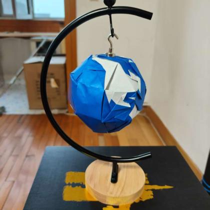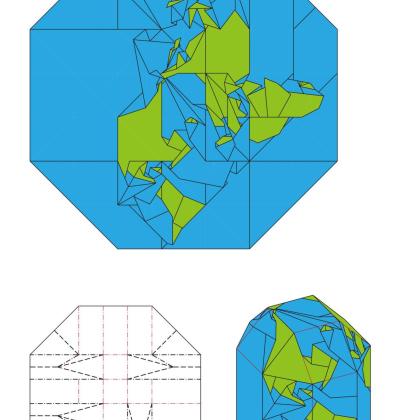 Through folding alone, the designer succeeds in drawing the surface of the globe, with major continents and regions that are clearly identifiable, correctly positioned, and legible on a closed volume.
