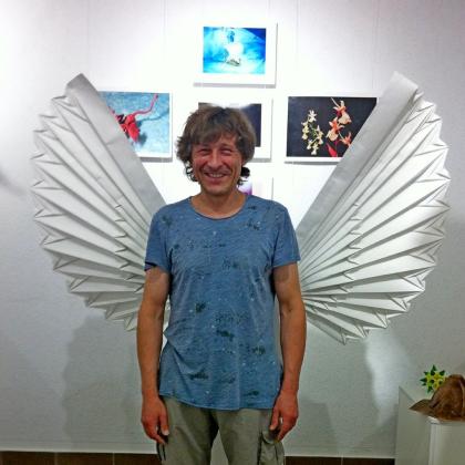 One square sheet of Elephantenhaut paper 110g/m2, 27x27 cm, without incisions or gluing. Used two steel balls for eyes. Model height 20 cm.