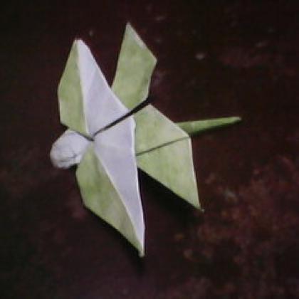 This dragonfly was one of my first designs, a long time ago. It starts from a frog base, with the wings being the four large flaps at the corners of the square and the head being one of the small flaps. The most recent version of this model (which I call Dragonfly version 4) still uses the frog base, but with grafts to create the legs and add details to the head.