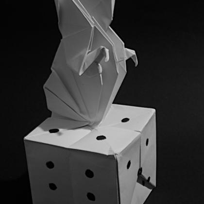 Characteristics of Fred Rohm's kind of Origami are multiple forms - a rabbit dancing on a cube, a small flock of birds clustered on a bird bath, or a watchdog emerging from his doghouse. At the suggestion of his secretary, he developed his "Chick-a-Dee" from the Simplex Base. Seen in one position, the completed figure is a baby chick; seen in another position, it is a bird (a chickadee) sitting on a tree branch.