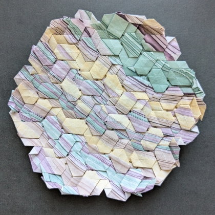 Tessellations in particular allowed me to start designing my own models. There always seem to be new ways to combine known twists, pleats, and bases to create a pleasing fold, and even altering something as simple as spacing can lead to surprising and fun new models. My favorite part of tessellations is how you have up to four views of a model - front side, backside, and backlit versions of both. I've been experimenting with ways to present multiple views, such as with suncatcher designs, floating, and backlit frames, and hope to continue finding new ways to display works.