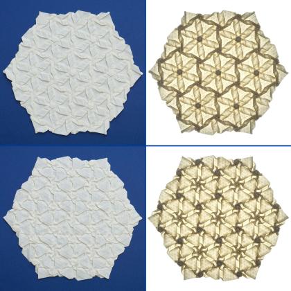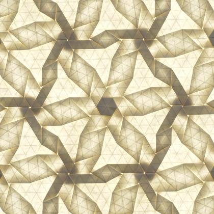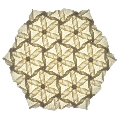 The use of multiple distinct hexagon and rhombus twists in Showcase indicates a mastery of symmetry and twist transformations that has not been previously explored. Furthermore, a rotated grid is used that exactly aligns the pattern repeats with the edge of the paper, allowing the striking backlit features to shine. While Showcase uses standard twists, the conceptual complexity and density of folding require absolute precision and attention to detail.