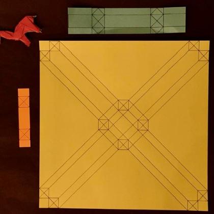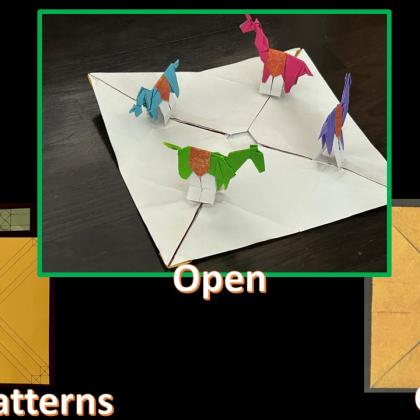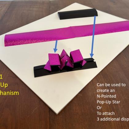 The model displayed opens from each corner allowing to display 4 separate figurative models which can be rocked when the pop-up model is opened. As shown each figurative model is an original model (my design) which can be folded from a square. However, each of these models can be removed and replaced with many different existing models and will work with the designs of other creators without having to modify the existing design.