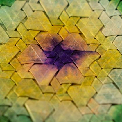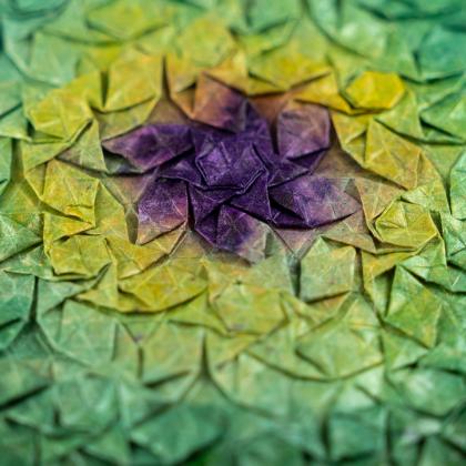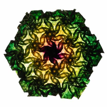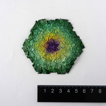 The original model was discovered/ designed by Madonna Yoder for her Advent of Tess event for a 16 X 16 X 16 grid hexagon. As with the other models from this series, I was enamoured by the beautiful pattern and challenged myself to extend the symmetry out to a 48-fold grid on a hexagon of side 14.5 cm. The paper used was Banana fibre paper which I dyed to give the look of a bed of flowers in a field. This is by far the densest pattern that I have folded to date as the twists overlap each other. The grid size is roughly equal to 0.3cm.