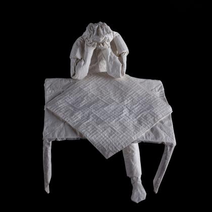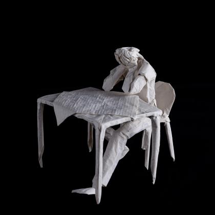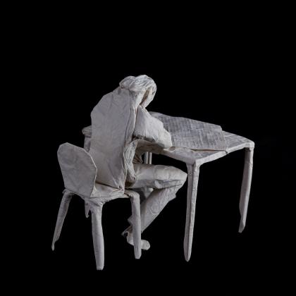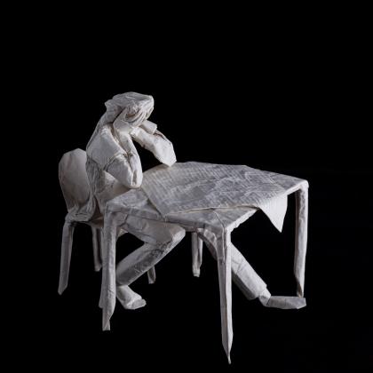 This work was folded from one uncut square of handmade 90x90cm abaca paper. The table connects to the figure at its left hip.