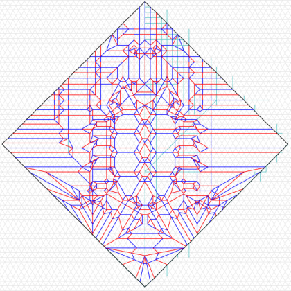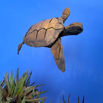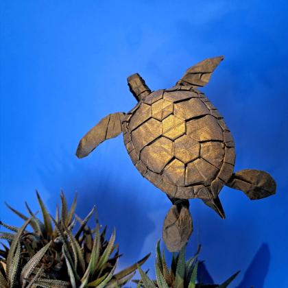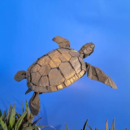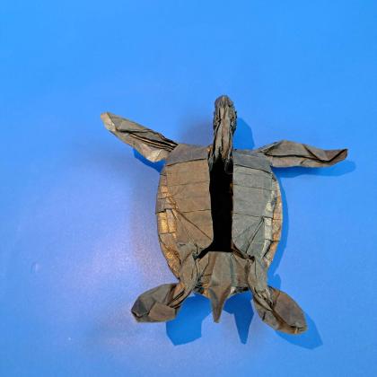 Since I think that the technique should support the final model, I combined Boxpleating and Hexpleating in this design. The shell and the hind flippers use Hexpleating, the head and the fore flippers use Boxpleating. Designs combining these two techniques are extremely rare, it´s a mostly unexplored field. Combining Boxpleating and Hexlpeating made the grid quite unique: The head and neck lie on a 26 diagonal grid, the grid for the shell and for the fore flippers can be constructed from there.