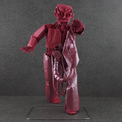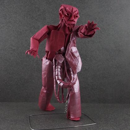 Elegance or beauty are often represented in origami. But what about fear, disgust or unneasiness? The main difficulty with designing this model was finding the right details to represent these inherent concepts for a zombie. I could've done a twisted arm or missing leg, but insides spilling out was just what I needed.