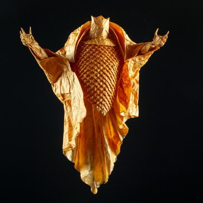 Since the final model is folded from an uncut sheet of handmade paper, the deckle is visible along the edges of the cloak to make it seem older and worn.