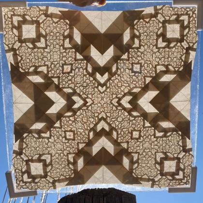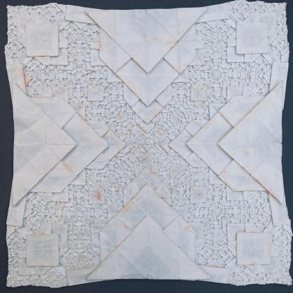 To me this model represents the race to the bottom present in origami design. There is almost a competition to make the most complex model with the highest grid. As I designed this fractal origami model, I came to understand that the beauty in this model was in the less intricate details. This model wouldn't work if every single part of the paper were just folded smaller and smaller. Even though this is the most complex tessellation that I've ever folded, I find it interesting because of the patterns in the large tiles just as much as the tiny recursive folds.
