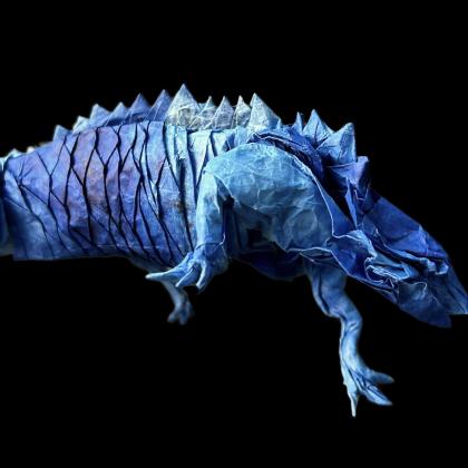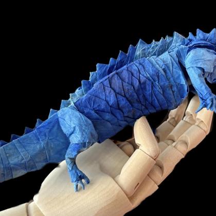 The idea that propels this design is the need to include spikes and realistic scales while also suiting an overall model ratio. The artist believes he has successfully created a lizard with both- a fully scaled body and somewhat hexagonal scales throughout the achievable body region. He hopes to refold it with a greater scale-count and more spikes, of course. The paper was created with cheap tissue and fountain pen ink, a new coloring mode to consider.