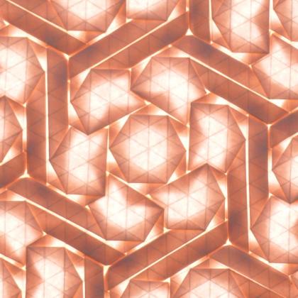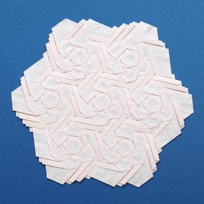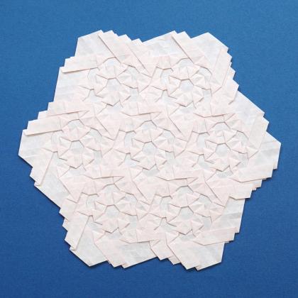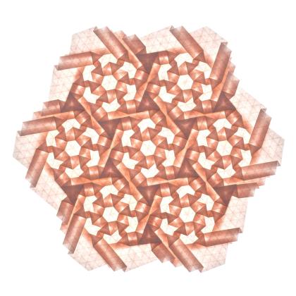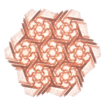 This piece was folded from a single sheet of paper using hybrid hexagon twists and the pattern can repeat infinitely.