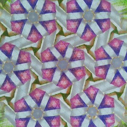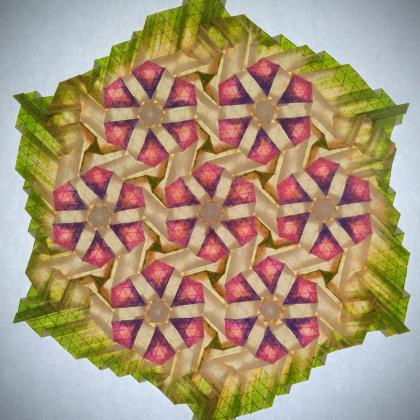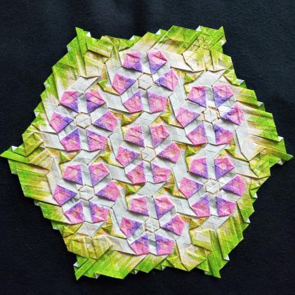 An interpretation of the tessellation design 'Clematis' by Madonna Yoder. Using colour applied before folding to enhance and transform the piece, highlighting some of the individual twists and playing on the name by emphasising the flower shapes. The piece is oriented differently on the paper to the original design and extends the pattern slightly.