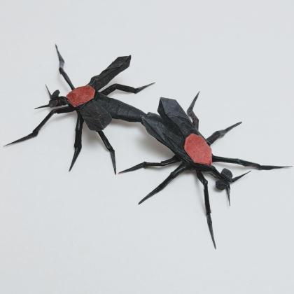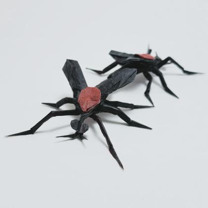 This model shows a pair of mating lovebugs. Both subjects are folded from one square of paper, and color change is used for the red of their thorax. The model is designed with box pleating and uses a somewhat asymmetrical structure to create a symmetrical result.