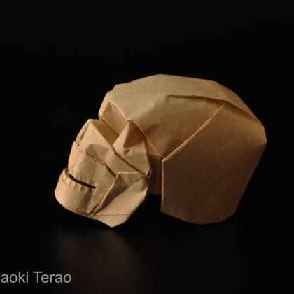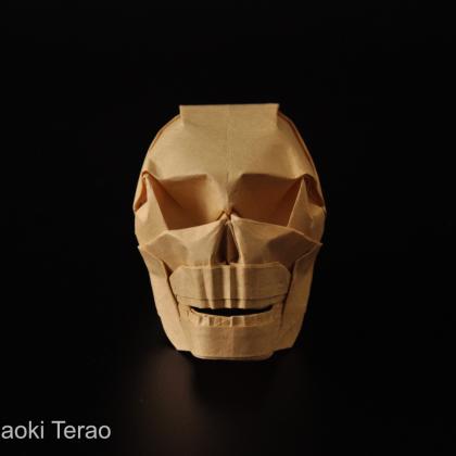 There are many origami skulls, but creating the different cavities realistically is not easy. This one uses hex pleating. With 30-degree folds, it is easier to create 3D features. The cavities for the eye sockets and for the nose are not flat-foldable. The eye sockets are already three-dimensional once collapsed, but are triangular at first. They are later inflated and rounded. The nose is created using two sinks which lie perpendicularly to the front of the model and are then inflated. The jaws are folded flat and then bent in place and shaped.