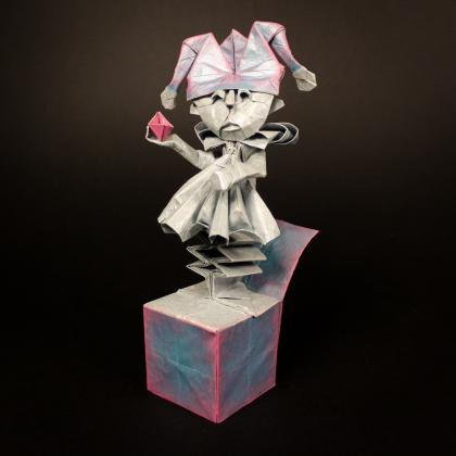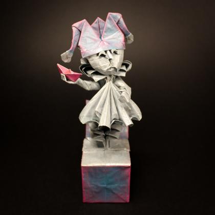 The Clown Box, a creation by Han Ji Woo, takes on a new, vivid interpretation in this rendition. Folded from a 57 cm double tissue, the paper was carefully chosen to enhance each detail and bring lightness to the composition. The essence of the original model remains intact, but with subtle touches that add a unique narrative.
