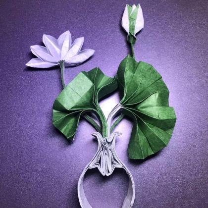 This model was designed from a single square sheet of paper to create a vase, lotus flower, and lotus leaf.