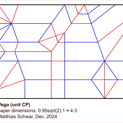 Additionally, i envisioned that the faces of the polyhedron should not show extra creases/pleats and the tabs/hooks connecting the modules should be invisible, to get the illusion of unsupported triangular sticks forming the polyhedron, nevertheless holding together tightly. Because the model is a highly geometric and rigid compound, the units where designed in a way that major folds have multiple reference points, countering folding inaccuracy and ensuring that all modules fit together in the end. All reference points are conveniently obtained during the folding process, only initial division of the paper into fifths requires other methods to prevent the introduction of unwanted creases. The paper proportions (rectangle) for the modules are 0.95sqrt(2):1, an approximation of 4:3 is suitable. Both sizes could be easily cut from a silver rectangle or a square respectively.