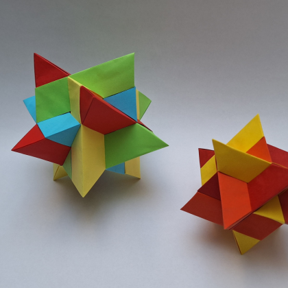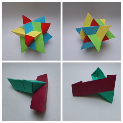 In the past, i have come up with modular origami designs of octahedral RD stellations, using only 12 units, each one a 3-dimensional triangular "stick". For this model i reused some of their design elements, due to aforementioned reasons. However, combining them required some extra effort. Especially, a triangle twist is incorporated to generate pleats which serve as pockets later. This way, still only 12 identical units are required, despite the more complex structure.