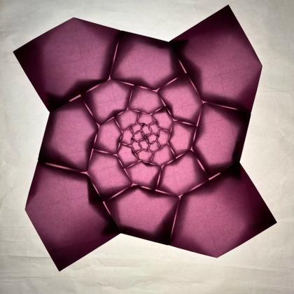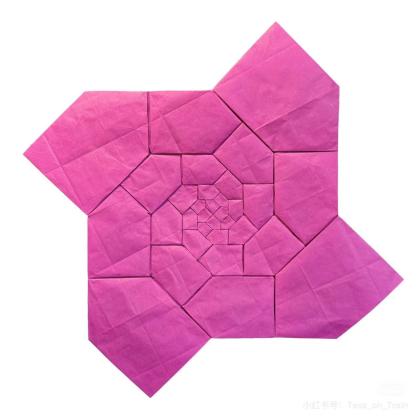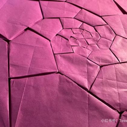 This is a flagstone recursive tessellation, the feature is that the entire work on the front is completely composed of the house shaped pentagon. Flagstone style refer to tessellations whose visual effects consist purely of tightly connected polygons.