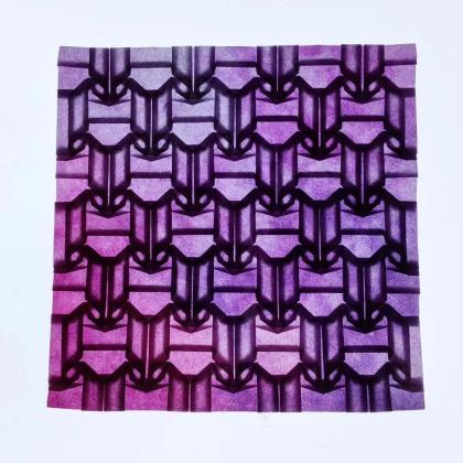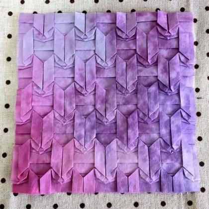 This is an origami piece made from a single sheet of washi paper. Yagasuri is a traditional Japanese pattern used for celebrating new beginnings, such as marriage. You can search for "yagasuri" on the web. Its creator made the piece as a gift; we are always looking for connections.