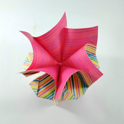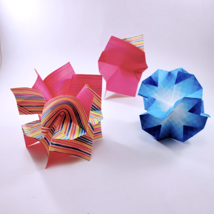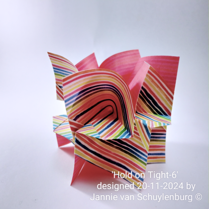 With this model I wanted to try to make a model that was very sturdy with as few folds as possible. With only two folds, 1 diagonal valley fold on the right side and 1 vertical valley fold on the other side, that was possible. Then the elements were placed on top of each other and 2 points, next to each other, were folded around each other. This way it holds itself very firmly. It is possible to use 3, 4, 5, or 6 elements. You can even make a very sturdy ball out of it. It was enjoyable this challenge.