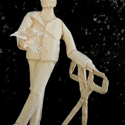 Kirigamist Lang, a depiction of Robert J. Lang leaning on a pair of scissors while holding out a kirigami crane, explores a terrifying hypothetical at which any origamist would rightfully shudder—a world in which the community’s esteemed Robert J. Lang found intrigue in scissors rather than squares, neglecting folding in favor of cutting. To satisfactorily horrify origamists with such a prospect, the model incorporated box pleating techniques, including complex pythagorean stretches to swivel the arms, level shifters for a closed body, and partials assisting with fine details, all with a secondary goal of innovating through simplification (in a manner similar to Drew Heskett’s Golofa Beetle) by minimizing the grid of the model. With a final height around one third the length of the starting square, this was all achieved at no expense to efficiency, in part due to the unorthodox connection of the legs above three units.