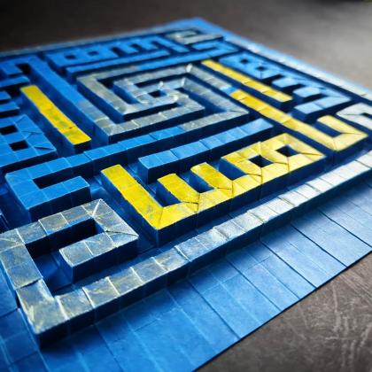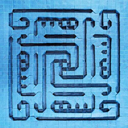 This design is a name ornament inspired by square kufic calligraphy. The maze pattern contains four interwoven, highly abstracted representations of the Persian female name Anahita (آناهيتا).