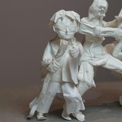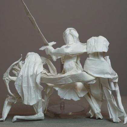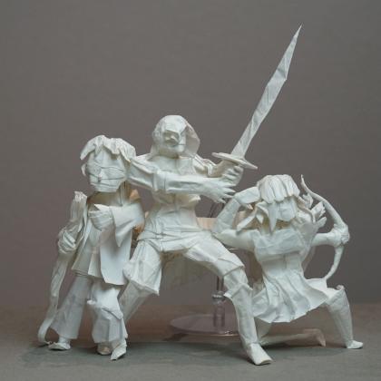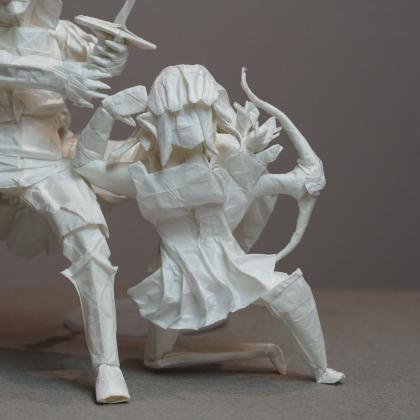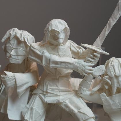 Each figure in this model was designed and folded by a different designer in their own artistic style, creating an interesting stylistic contrast between each figure. The model is folded from one uncut square of paper and was created collaboratively during the Origami USA Convention as a testament to the power of friendship that bonds the designers together.