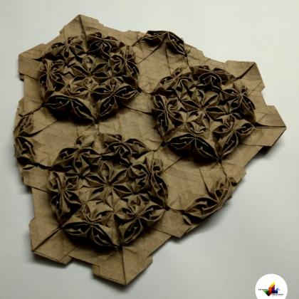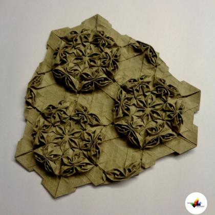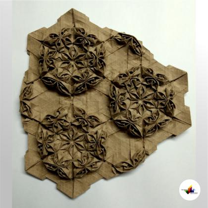 As compared to the few reverse-engineered versions, this interpretation pushed the limits of the author’s original single-molecule design by incorporating uncommon techniques such as spread sinks and pleats of hex pleating and the miura-ori fold (see attached crease pattern), enabling the said single-molecule to be duplicated and connected to each other to become a tessellation. Given such structures, a tessellation with seven complete molecules is also possible to fold. The purpose of tessellating the said molecule was inspired by how the author, Timur Menyalshchikov, later interpreted his original design. The tessellation resembles a small garden of flowers of which the appearance was aesthetically enhanced by the intricate wings of butterflies flying in the garden.