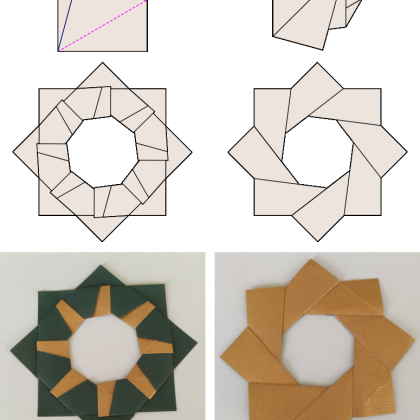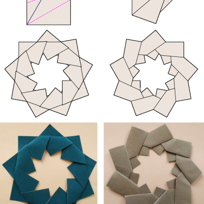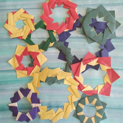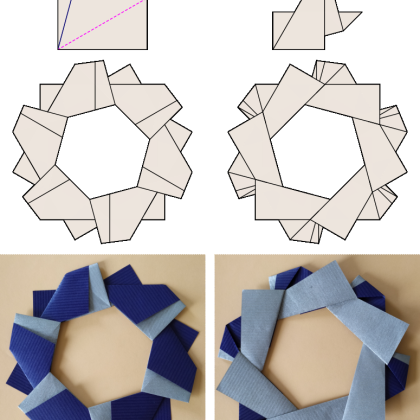 What if this paradigm of geometric folded is abandoned and exactness is be traded for simplicity. Series of more than 100 simple models called Mafra Rings resulted in such a way. Modules for all of the rings share similar simple crease pattern (5 lines, 4 folds). Rings may contain from 5 to 18 modules (including such strange numbers like 7, 11, 13). Actually none of the rings is mathematically perfect (a mathematician would say that they do not exist), but all of them close easily.