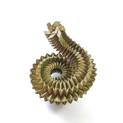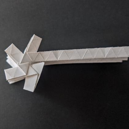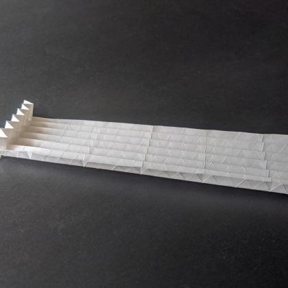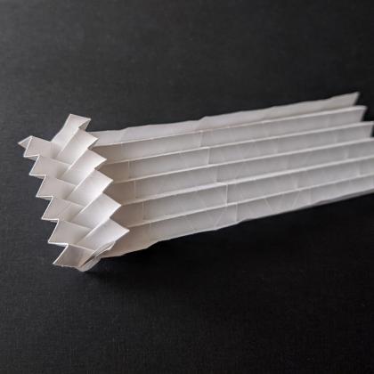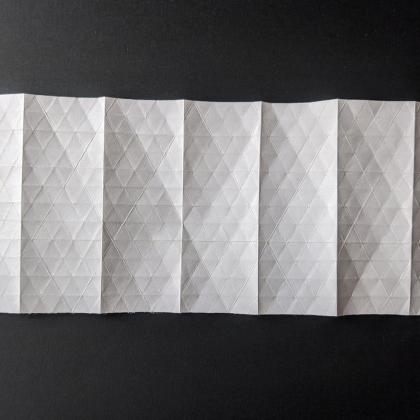 Precreasing large corrugations can be a very time consuming process. This is why I started looking into simplifying the patterns. This idea led me to a series of models that have no creases at all except the simple triangular grid.