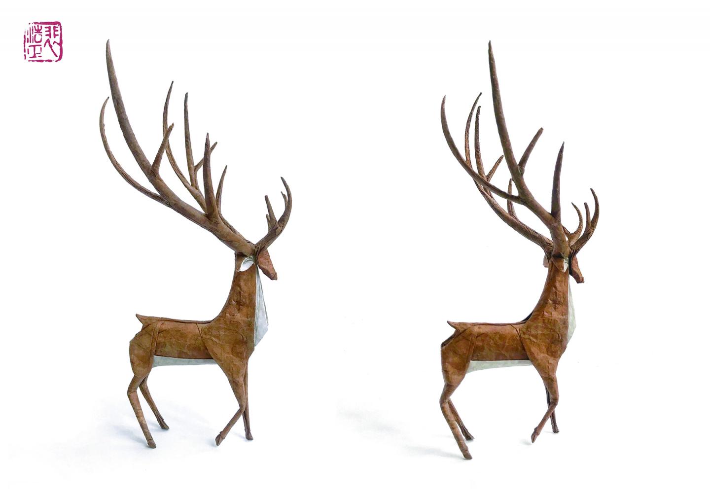 In terms of aesthetics, the texture of hand-made rice paper, the curve of shaping, as well as the application of golden ratio make the God of Deer vivid and graceful. Technologically, 22.5-degree angles and box pleating structures are perfectly combined in a rarely used crease pattern layout. As no flap is hidden or wasted, this model has an extremely high completed model ratio (around 0.618 in 3D). In a sense, it is one of the most beautiful origami deer in the world.