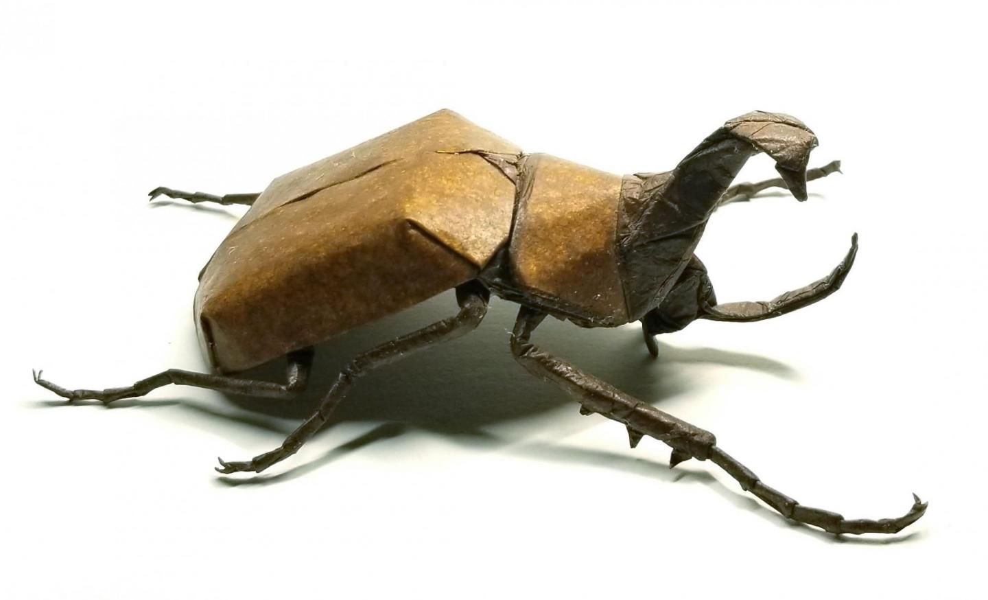 Return to EntriesOver the years, there have been massive strides in the genre of insect origami designs, with models becoming more and more complex and with larger and larger grid sizes. With this design, however, I sought to demonstrate that even complex subjects with high levels of detail can be achieved with relatively simple crease patterns and structures. I designed this model not with the mentality of packing as many details in with the most complex structure possible, but the simplest structure possible. I would hope that this model can show that even something as complex as a beetle with horns, legs, spikes, elytra, and much more can be folded without the massive grids and complex structures that many modern insect designs use. I would also hope that this mentality of simplicity over complexity wherever possible would be adopted by other insect designers and designers in general, as I believe it produces much more elegant crease patterns and allows more room for creative and skilled shaping.